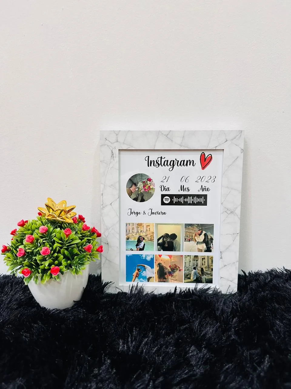 ¿Qué contiene? – 7 fotos – Fecha – Nombres – Canción (código YouTube o Spotify)